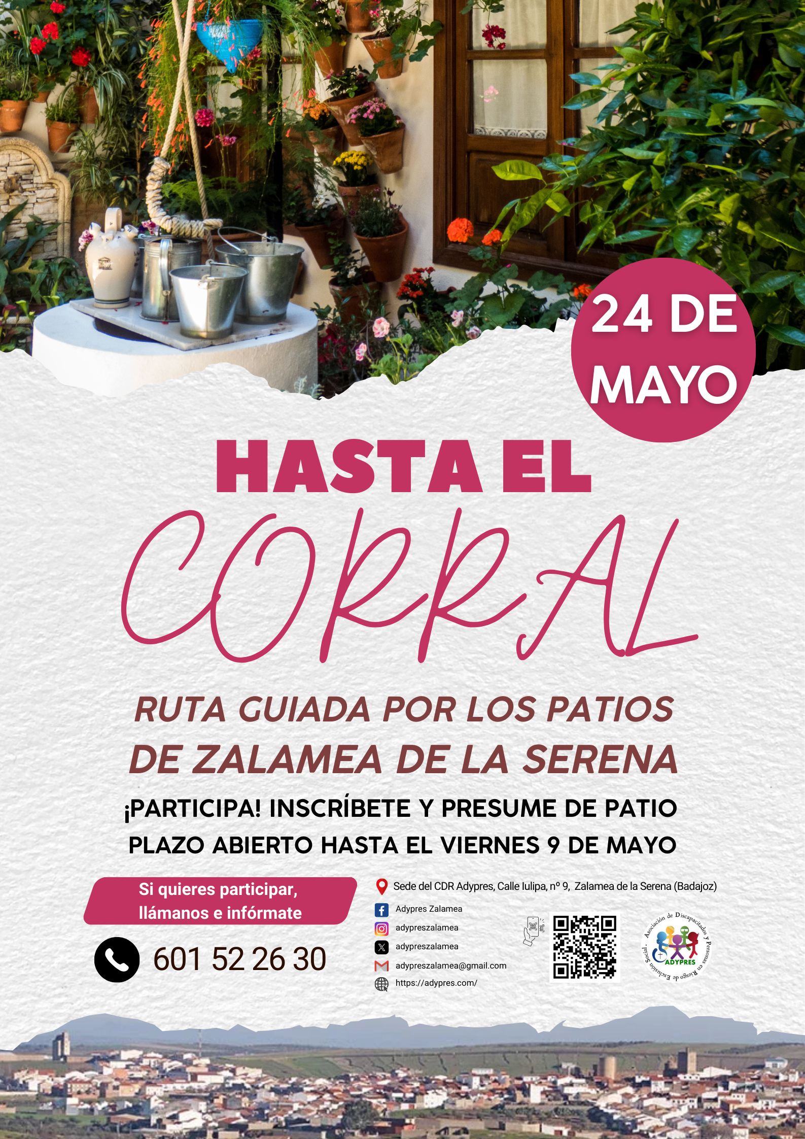 Desde el CDR Adypres Zalamea estamos trabajando en esta novedosa actividad para el próximo sábado 24 de mayo de 2025. Para ello, necesitamos contar con vuestra colaboración para hacer realidad esta ruta guiada por los patios de Zalamea de la Serena.