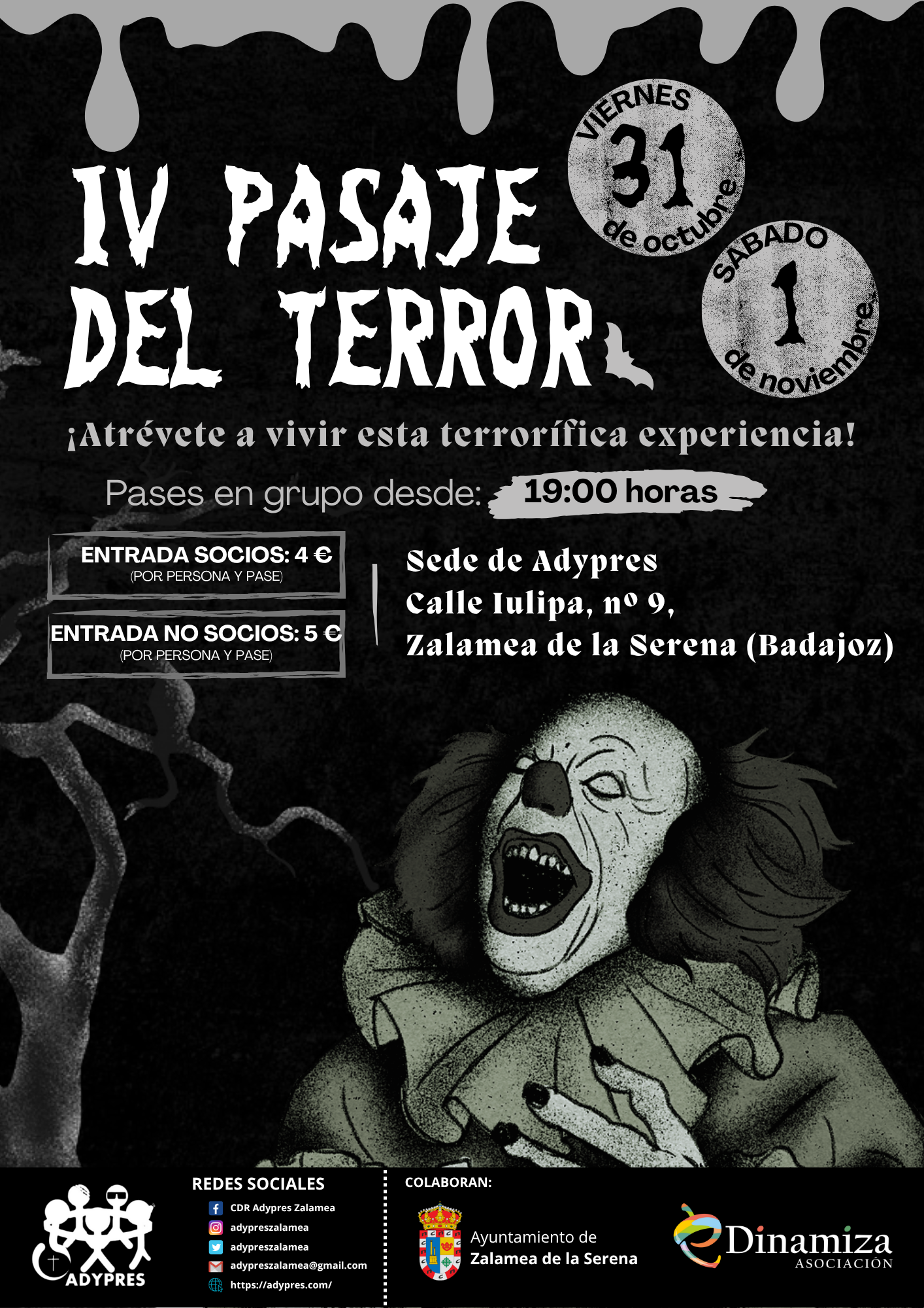 Desde el CDR Adypres Zalamea organizamos una nueva edición del «Pasaje del terror», que tendrá lugar en nuestras instalaciones el viernes 31 de octubre y el sábado 1 de noviembre, a partir de las 19:00 horas.