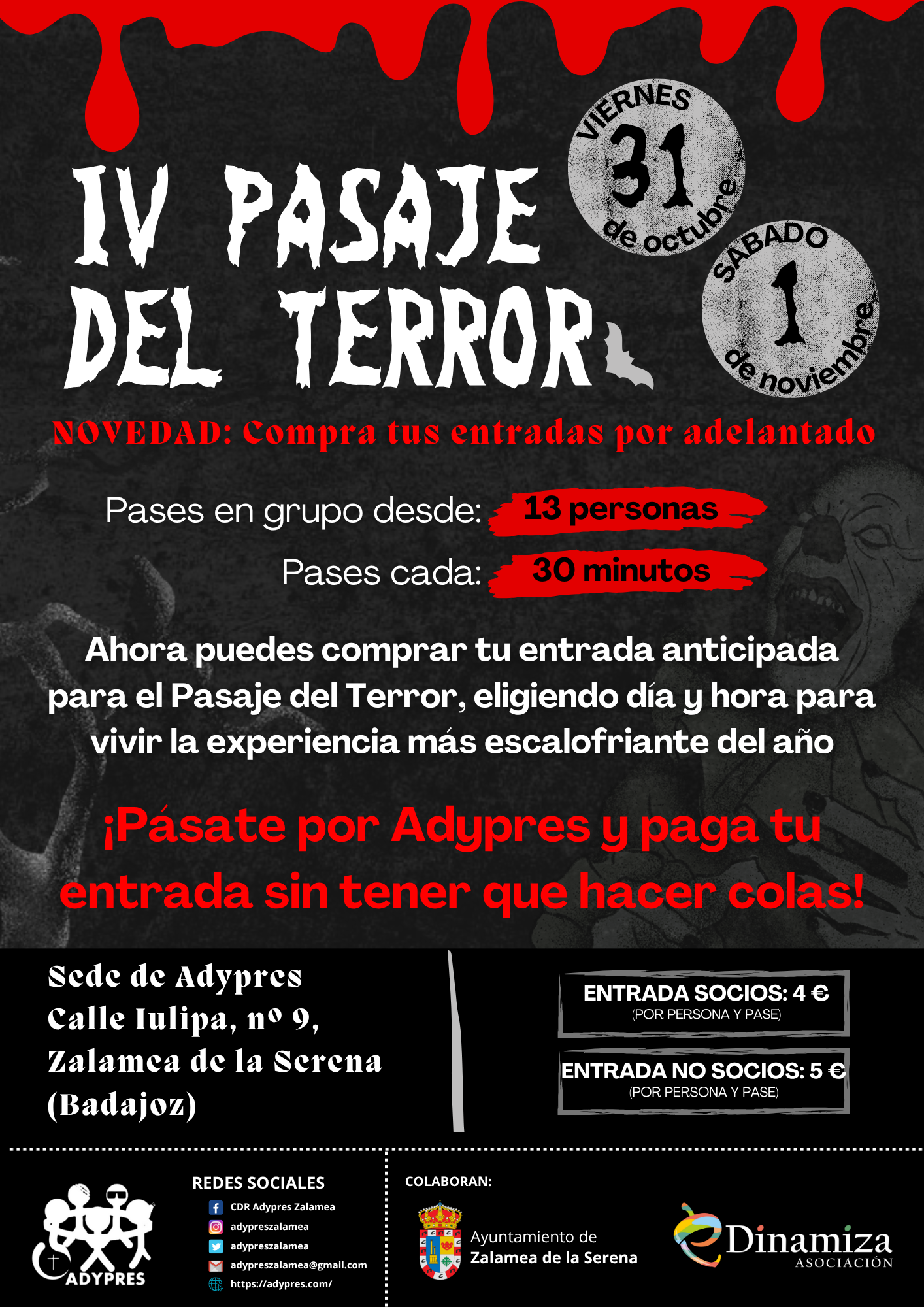 Consigue tus entradas para el nuevo pasaje del terror a partir de este lunes 27 de octubre en nuestras oficinas en Calle Iulipa, nº 9, Zalamea de la Serena.